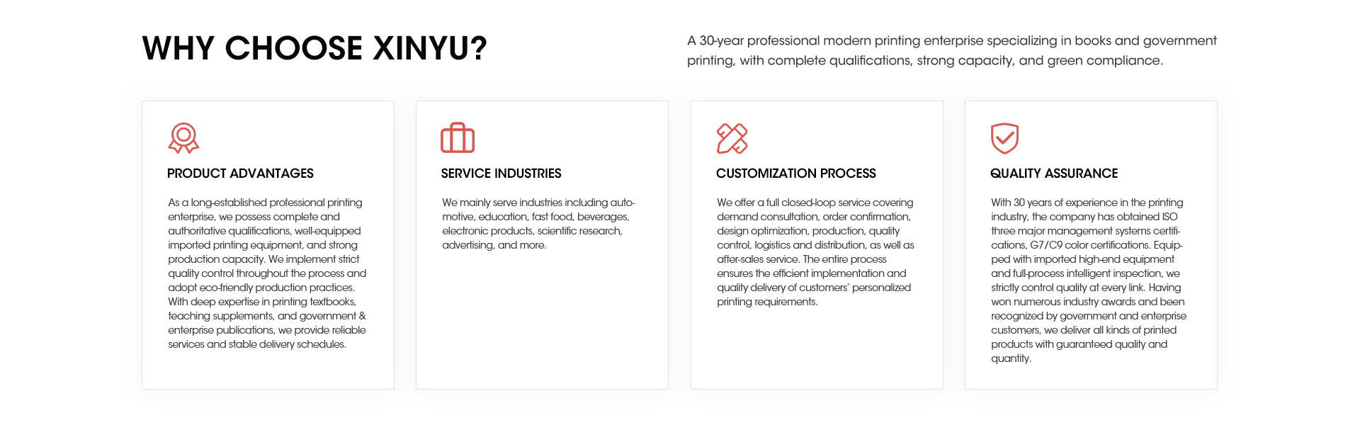 Provide personalized customization services based on the needs of different customers: For publishing houses, optimize the printing and binding processes of teaching materials and auxiliary books to ensure that the printing and binding quality meets the standards of industry evaluations; for government agencies, strictly follow the official document printing specifications and focus on confidentiality and compliance; for commercial customers, provide special processes such as hot stamping, partial UV, and anti-counterfeiting invisible inkjet to enhance product texture.